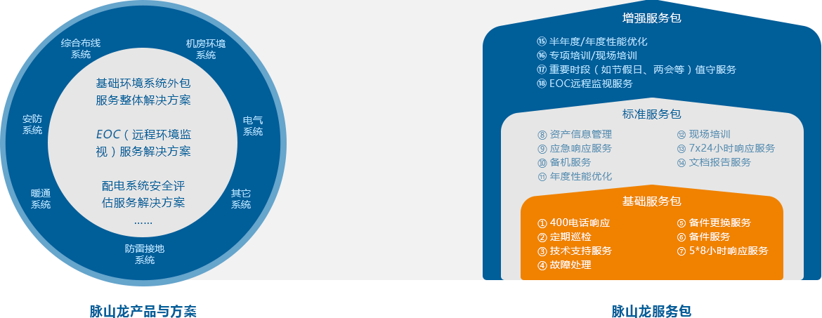 脉山龙数据中心基础环境系统运维服务针对电气、暖通、安防、机房环境、综合布线等系统及设备进行监视、日常维护保养和维修保障,帮助企业降低数据中心整体运维成本,提高设备利用率,使基础环境系统投资效益最大化。